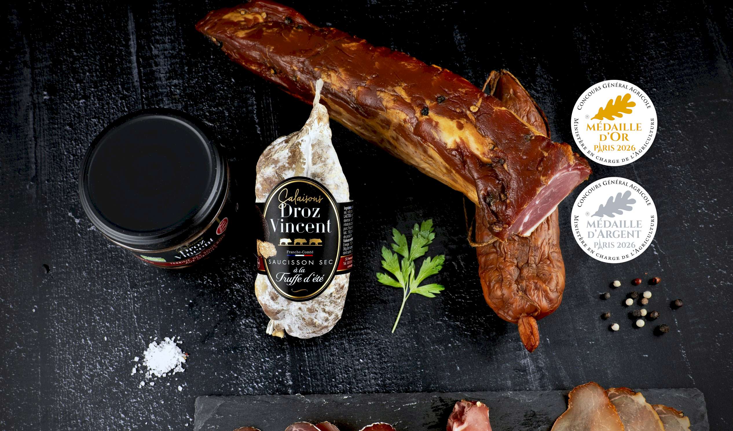 DROZ‑VINCENT y a brillamment été récompensée : Médaille d’or pour sa Saucisse de Montbéliard IGP et Médaille d’argent pour sa Saucisse de